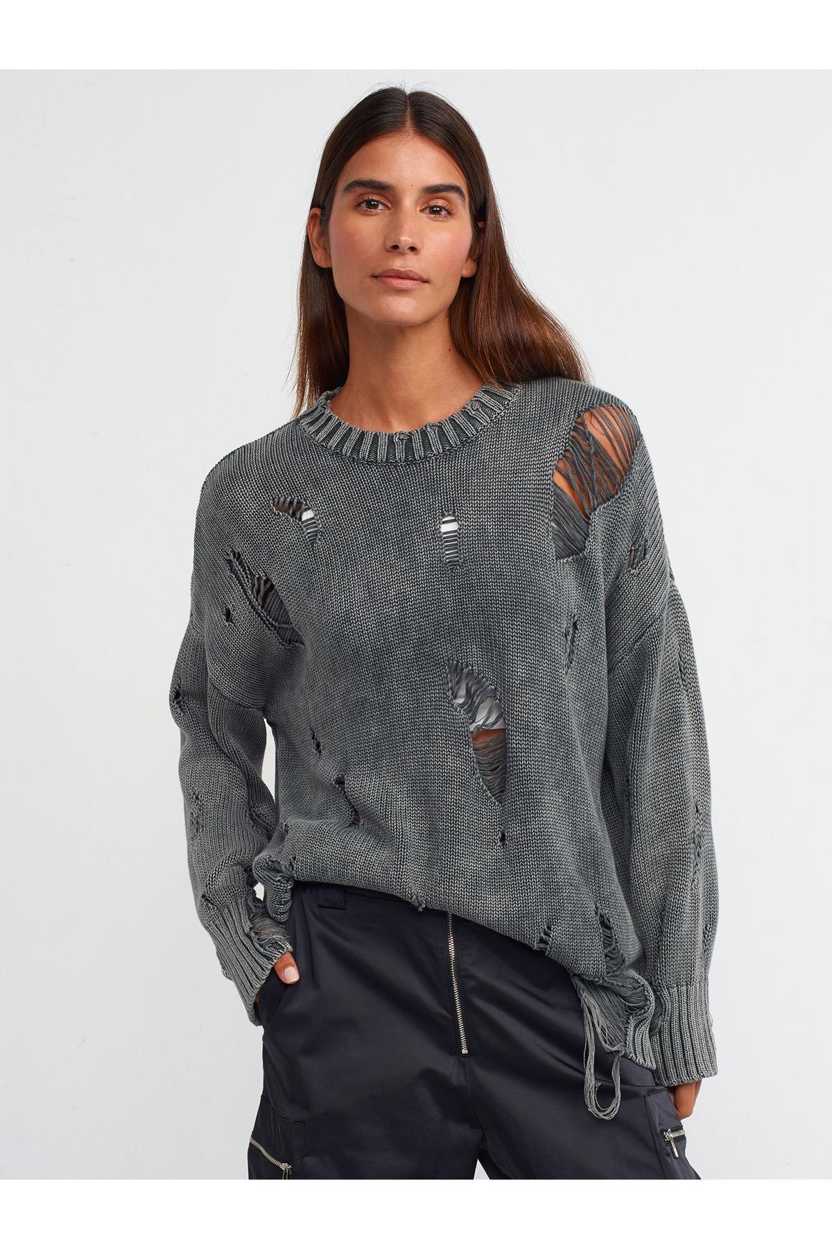 10479 Soluk Efekli Bisiklet Yaka Yırtık Detaylı Kazak-Antrasit